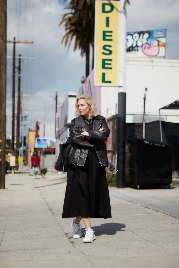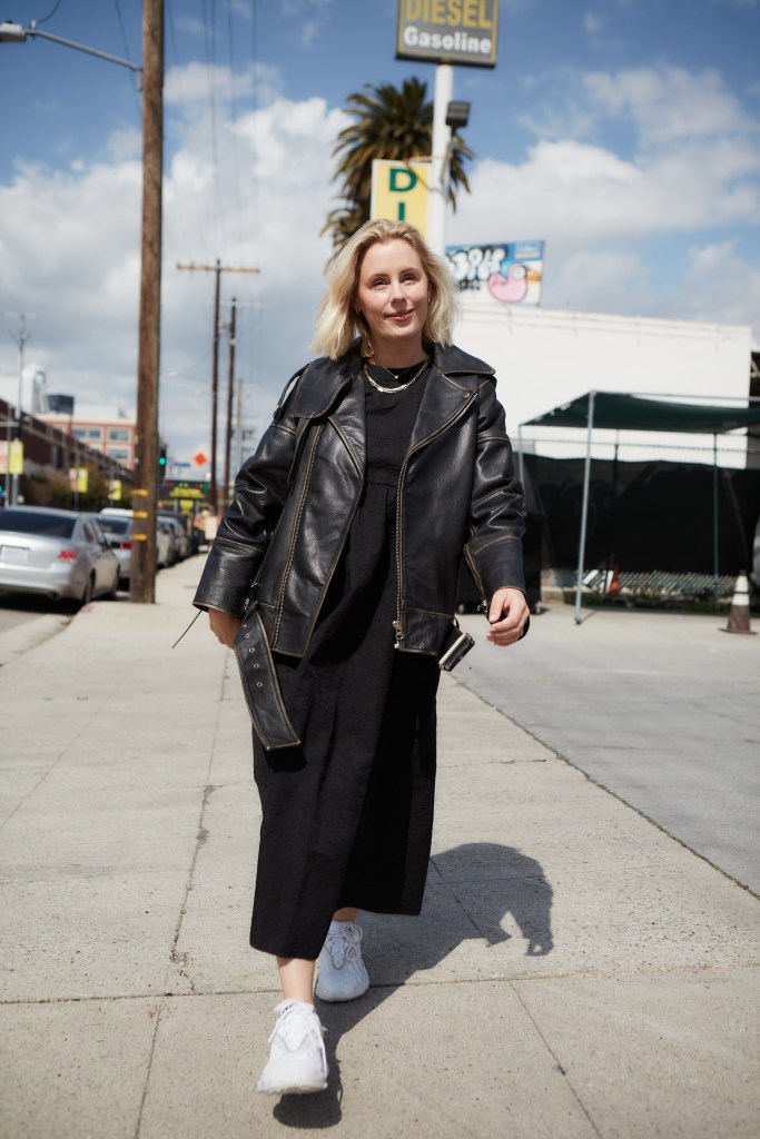Gillar skinnjacke-väder. Denna kommer By Malene Birger. Och gärna över klänningar, denna är från Cecilie Bahnsen. Skor, Adidas.