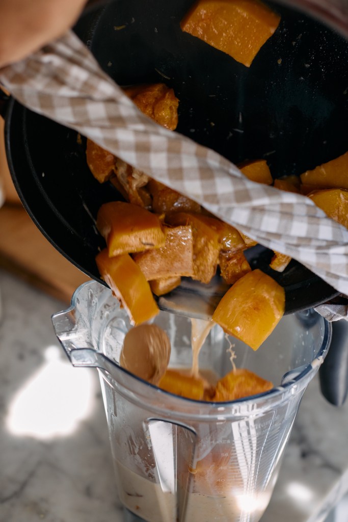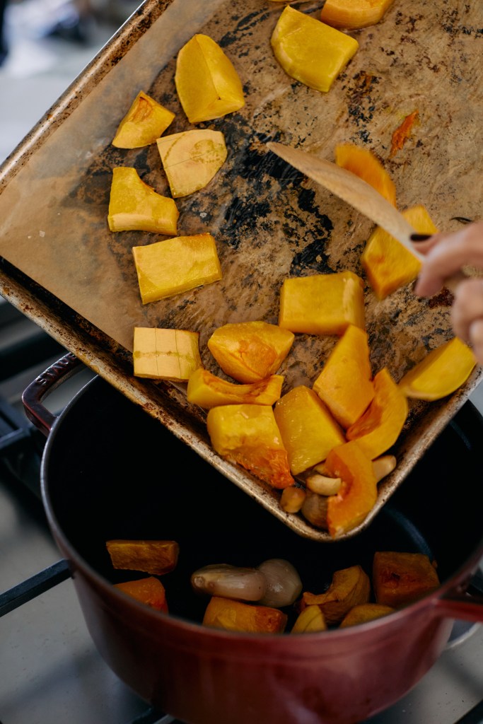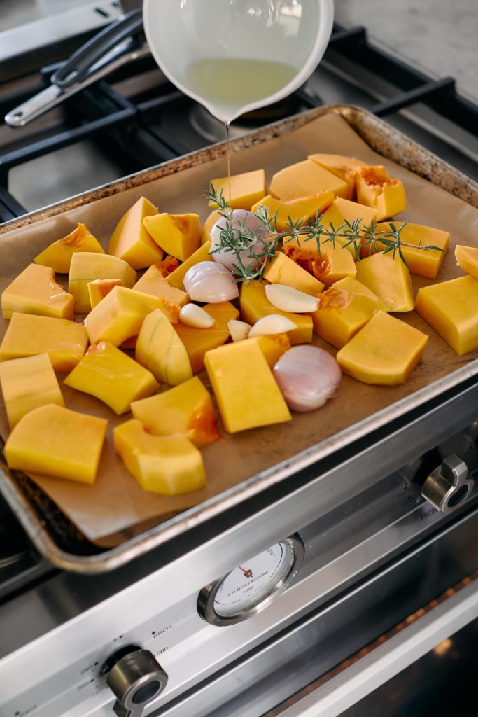 Skala och tärna pumpan och lägg på en plåt med schalottenlöken, vitlöksklyftorna och en kvist rosmarin. Häll lite olivolja på stoppen och salta. Rosta i ugn på 200 grader i 20 – 30 minuter.